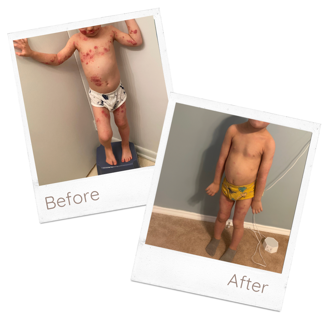 Our son was suffering from severe eczema and food allergies—his skin was constantly irritated, and his entire body was covered in rashes, especially his legs.Â